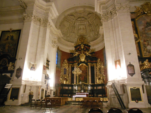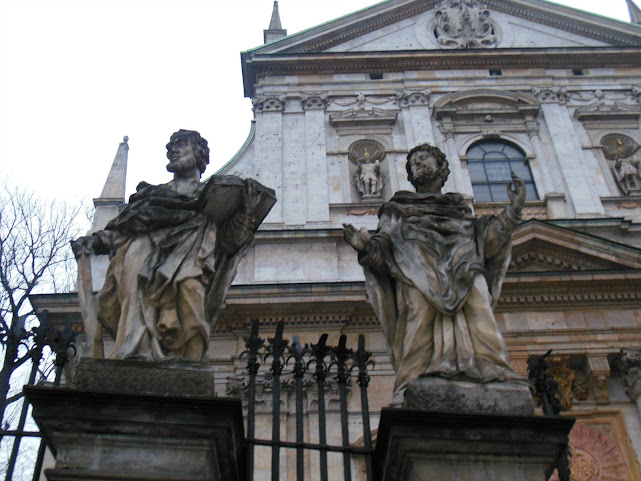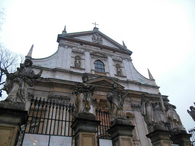 Walking down from the old market square of Krakow south towards the direction of Wawel castle, no one would miss the facade of this beautiful church. There are statues of the martyrs on top of the pillars of the front gate, seemingly protecting the church.