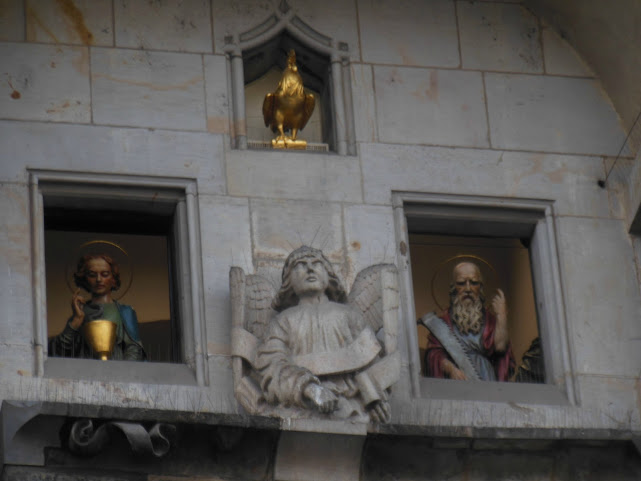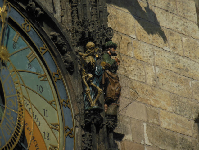 There are apostles coming out from the window above the clock on the hour, as the skeleton pull on the bell.